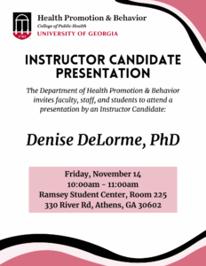 The Department of Health Promotion & Behavior invites faculty, staff, and students to attend a presentation by an Instructor Candidate, Denise DeLorme, PhD.